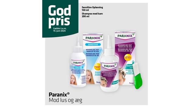 Lige nu kan du få flere forskellige produkter fra Paranix mod lus og æg til en ekstra fordelagtig pris på apoteket. Prøv med fordel Paranix Sensitive Opløsning 150ml, der er ekstra mild mod hår og hovedbund, eller Paranix Shampoo 200ml, der virker på bare 10min!
