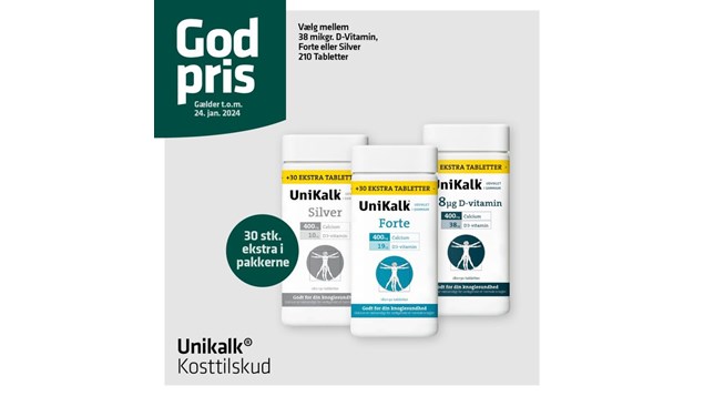 Kosttilskud fra UniKalk til en ekstra fordelagtig pris 💛 Vælg mellem 38mikgr. D-Vitamin, Forte eller Silver 210 Tabletter - 30 stk. ekstra i alle pakkerne! 🗓️ Gælder t.o.m. d. 24. januar Psst! ...