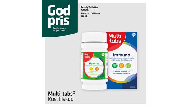 GOD PRIS på kosttilskud fra Multi-tabs 💊 💪🏽 Står du og mangler kosttilskud til familien derhjemme? Så er det nu du skal slå til! T.o.m. d. 24. januar kan du nemlig få både Family Tabletter 190stk...
