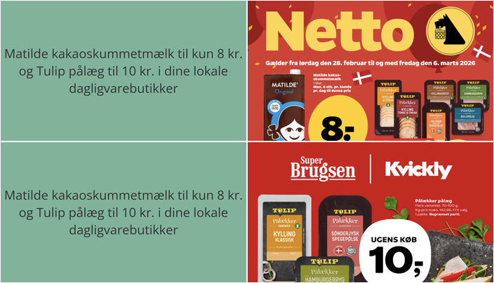 Netto tilbyder Matilde kakaoskummetmælk til en skarp pris på kun 8 kr. for 1 liter. Bemærk, at der er en begrænsning på 6 stk. pr. kunde pr. dag til denne pris. Tilbuddet gælder fra lørdag den 28. februar til fredag den 6. marts.