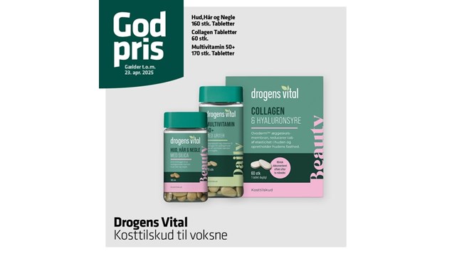 Vejlby Apotek fremhæver kosttilskud fra Drogens Vital, som er udviklet i Danmark med fokus på genanvendelig emballage og traditionelt anvendte urter. Der er en god pris på disse produkter indtil 23. april. Apoteket tilbyder også nem online bestilling af medicin og apoteksvarer. For mere information kan du læse det oprindelige opslag.
