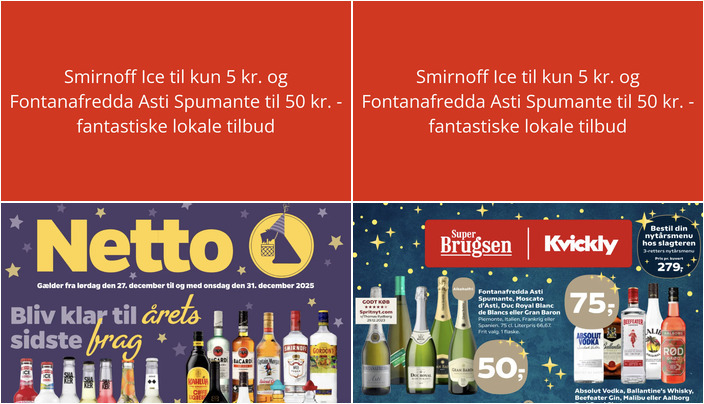 Netto tilbyder Smirnoff Ice, Shaker eller Mokai på 27,5 cl til kun 5 kr. pr. stk. Max 24 stk. pr. variant pr. kunde pr. dag til denne pris. Tilbuddet gælder fra lørdag den 27. december til onsdag den 31. december.
