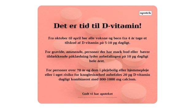Er du gravid, ammer du eller har du mørk hud eller bærer tildækkende påklædning lyder anbefalingen på 10 µg dagligt hele året. For personer over 70 år og dem i plejebolig eller hjemmepleje og i øget risiko for knogleskørhed anbefales 20 µg D-vitamin dagligt kombineret med 800-1000 mg calcium.